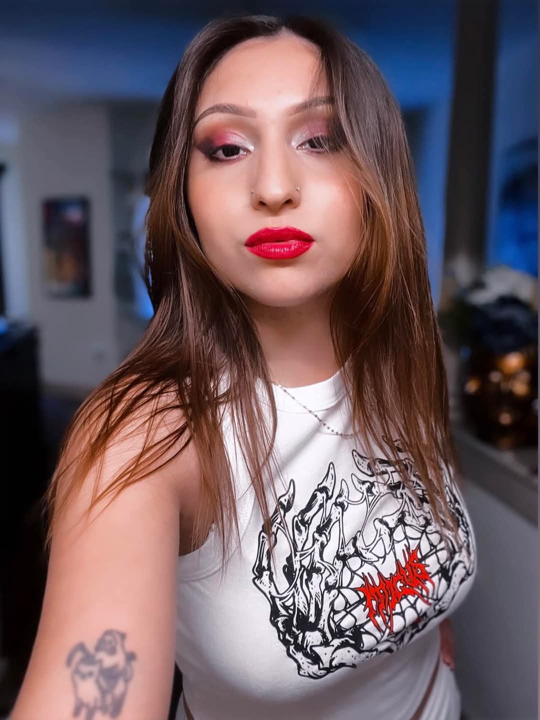 Meet our stunning model rocking the 'Skeleton Heart' white crop top in size XS!